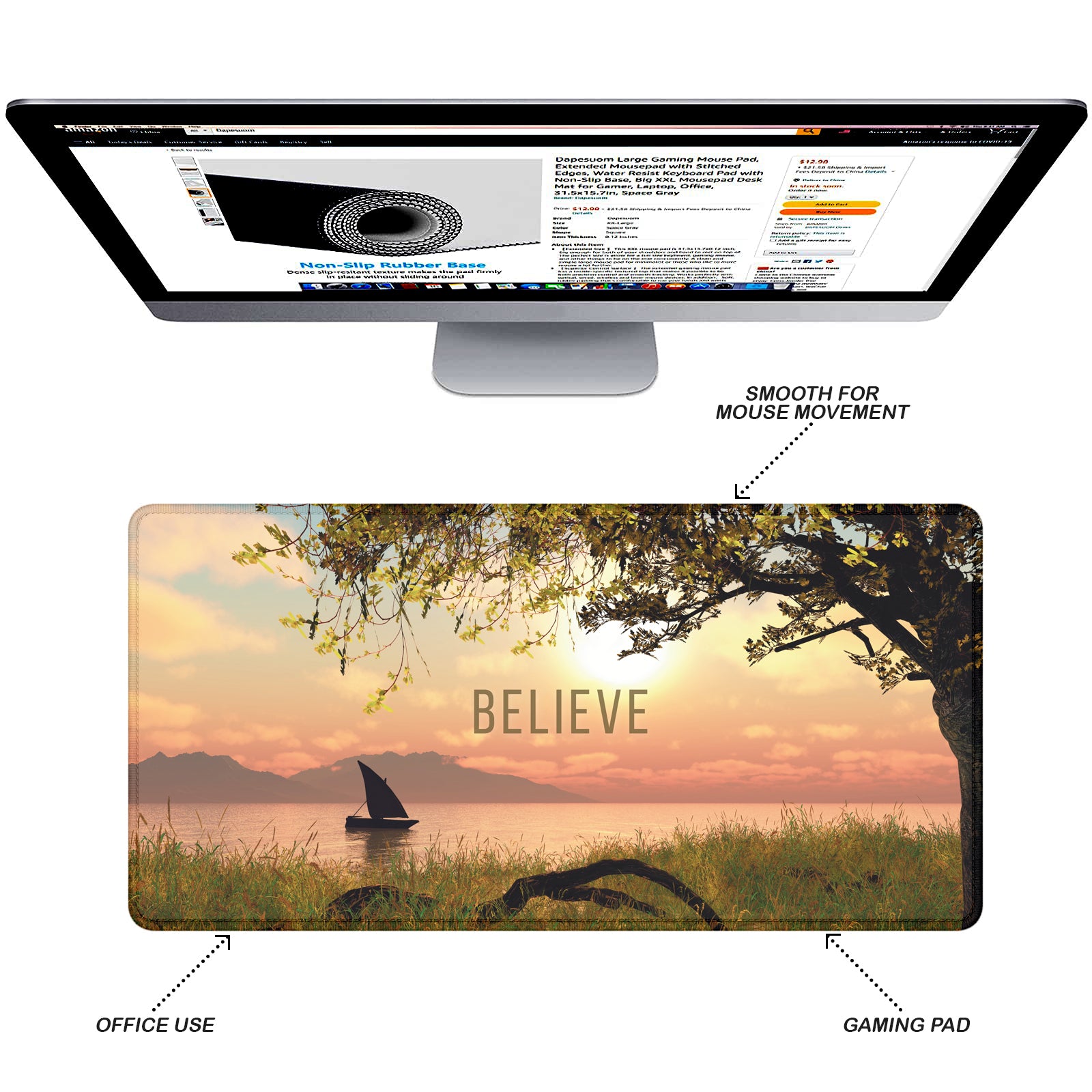 Transform your workspace into a place of peace and inspiration with the Believe Nature Stitched Desk Mat. Featuring a calming sunset scene with a sailboat and tree silhouette, paired with the motivational word “Believe”, this desk mat inspires positivity while enhancing your desk setup.